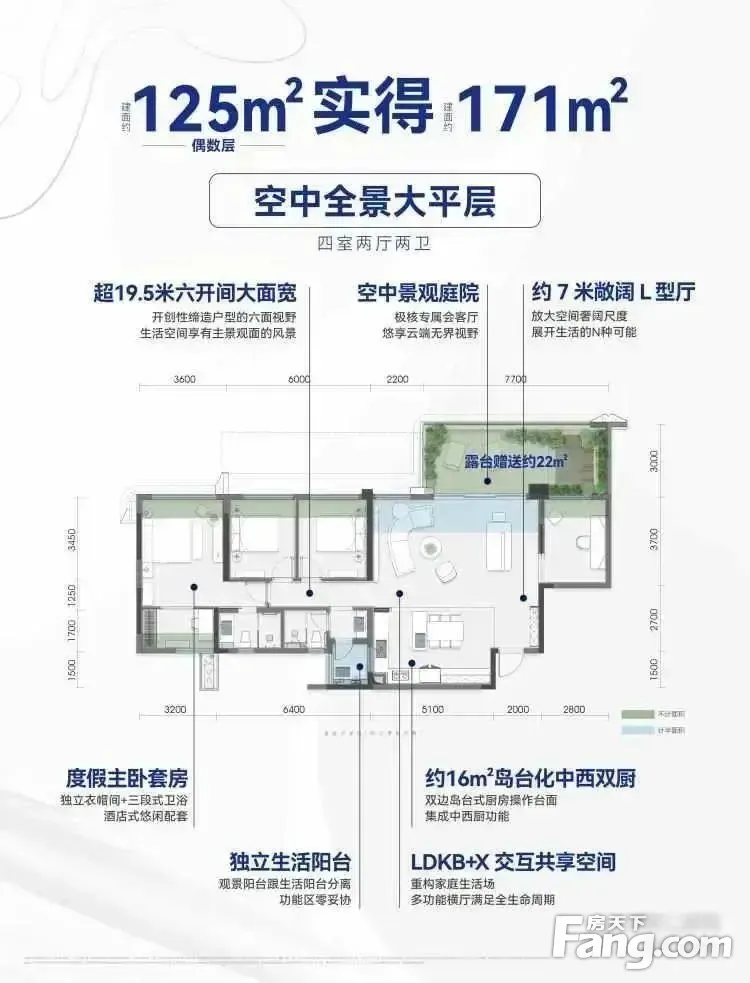 核心优势+卖点合集1、联发TOP级产品,豪宅典范,一城仅此一座2、观音桥2.25低容积率四代宅,16栋围合式布局大社区3、约1000㎡无边际游泳池,1300㎡架空层打造城市天际豪宅会所4、约680m归家圆环,五大海岛度假花园,11处林下无界空间5、全景落地玻璃幕墙+香槟金色铝板线条+0.55窗墙比6、豪华主卧套房+户户带6.3米空中花园,约19m景观大面宽7、建面125-185㎡得房率高达110-120%,实际使用面积171-248㎡8、配套:幼儿园+两江国际(嘉澍小學+宏帆8中管理校)9、1公里黄金生活圈:蚂蟥梁站200米+中环万象城约1公里(在建)
