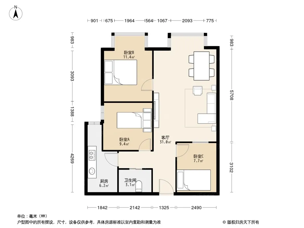 户型齐全,主打户型方正,明厨,明卫,客厅朝南三居
