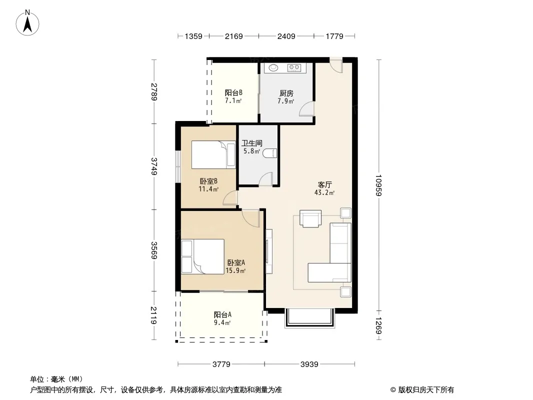 户型齐全,主打户型方正,明卫,明厨,客厅朝南,主卧朝南二居