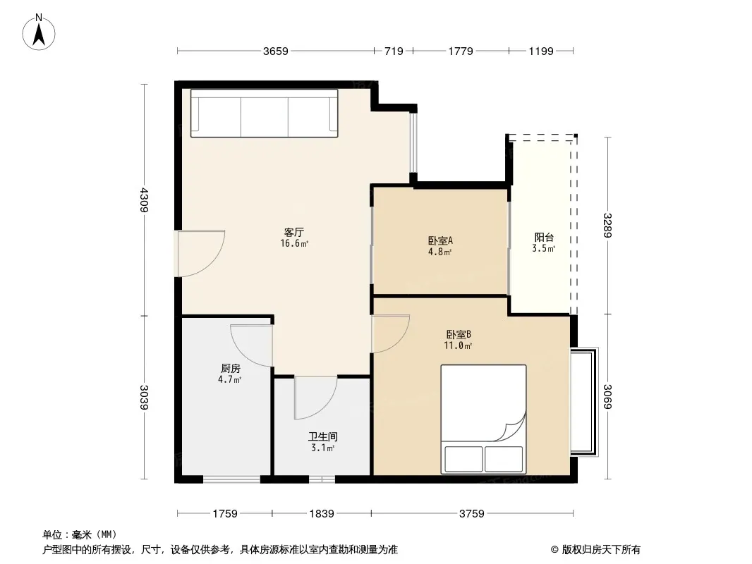 户型齐全,主打户型方正,明厨,客厅朝南,主卧朝南二居