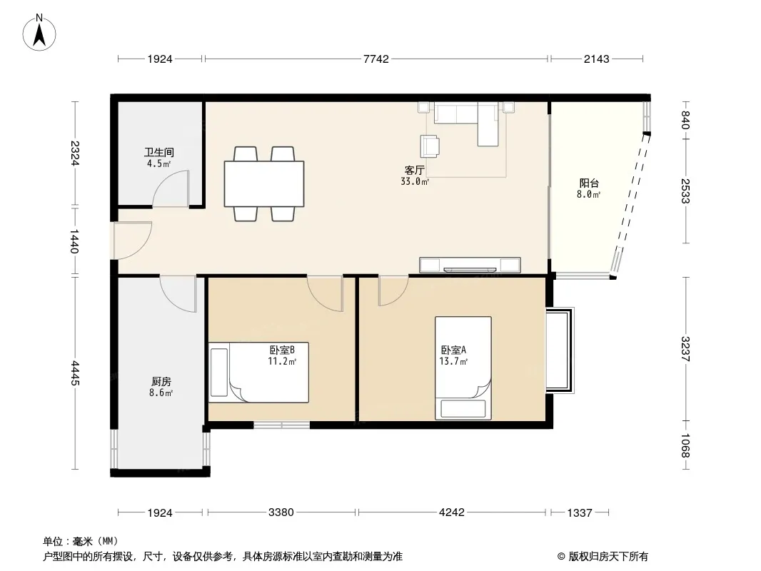 户型齐全,主打明厨,客厅朝南,主卧朝南二居