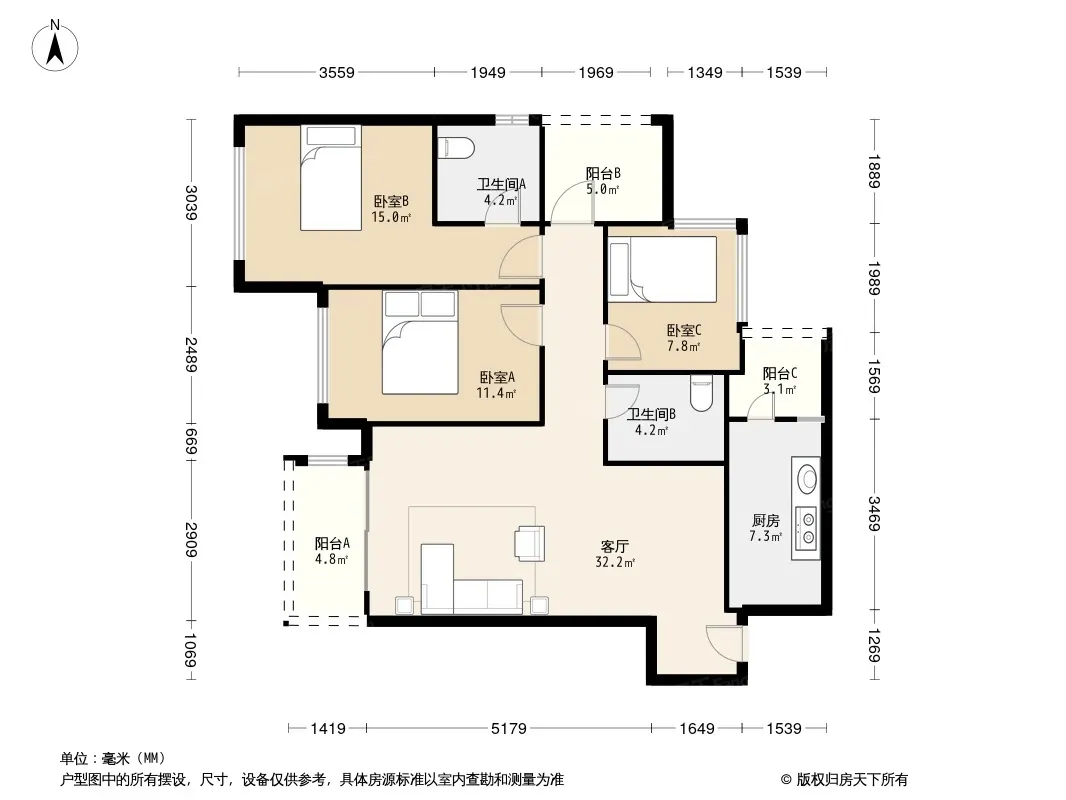 户型齐全,主打全明格局,动静分离,高附赠空间,采光充足三居