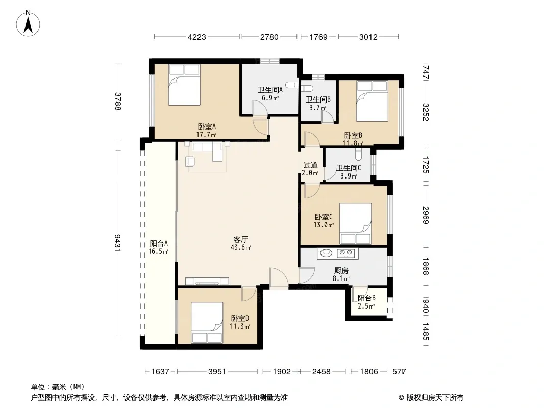 户型齐全,主打全明格局,户型方正,动静分离四居