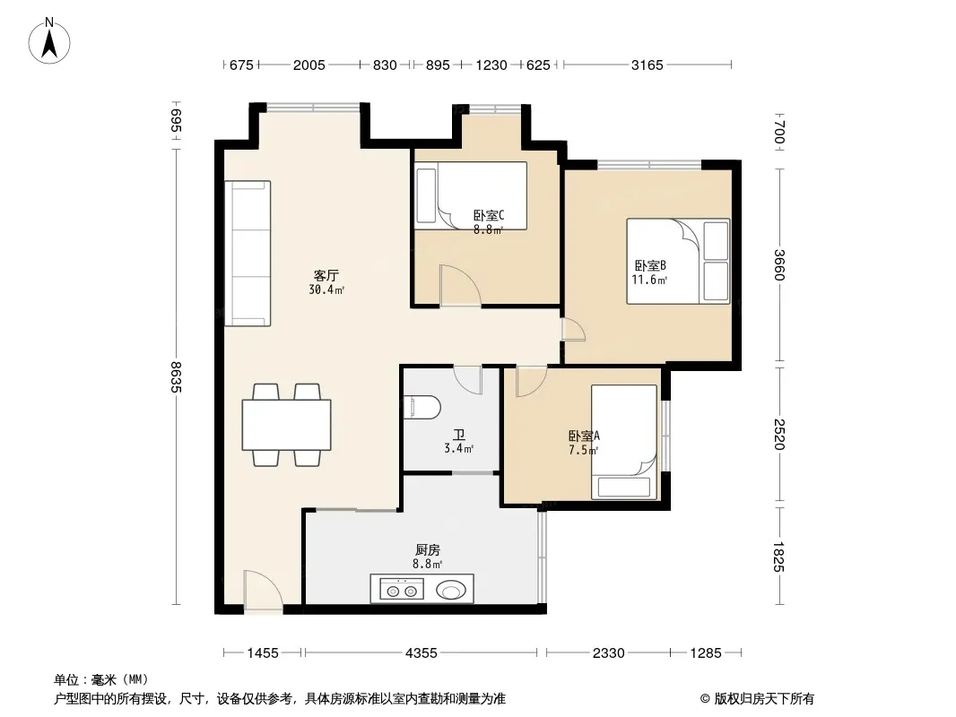 户型齐全,主打客厅朝南三居