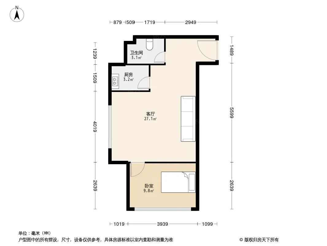 户型齐全,主打明卫,明厨,客厅朝南,全明格局一居