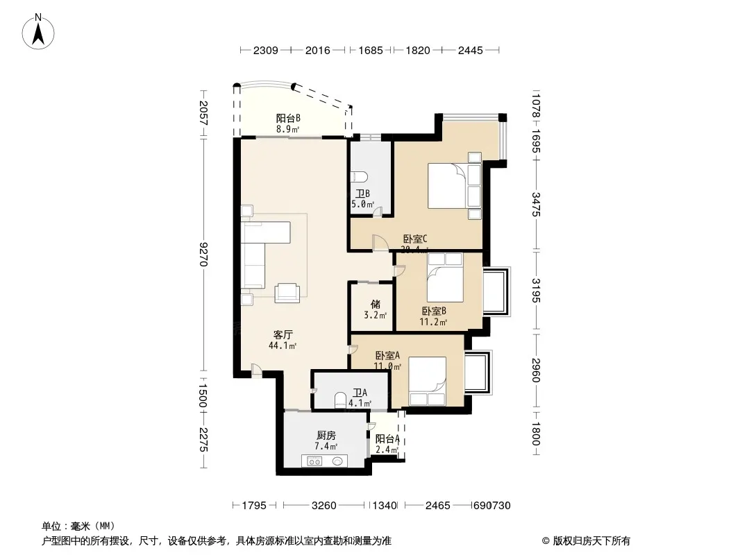 标准正规大三室两室两卫,户型方正,采光通透