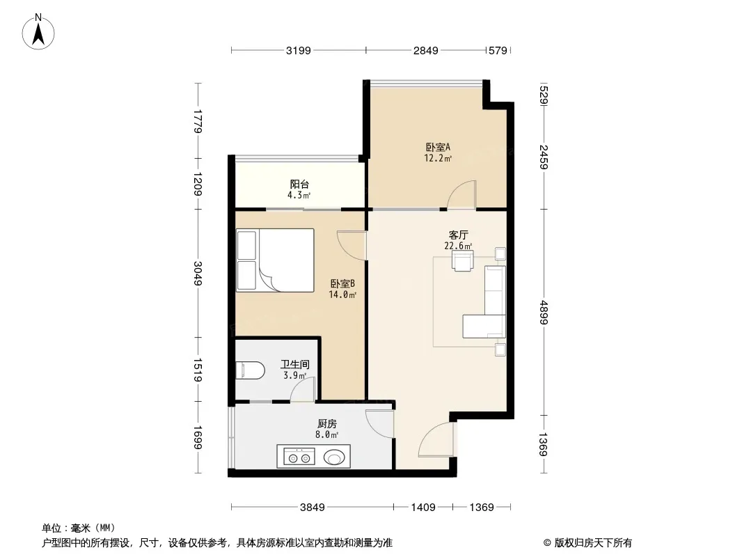 户型齐全,主打明厨,主卧朝南二居