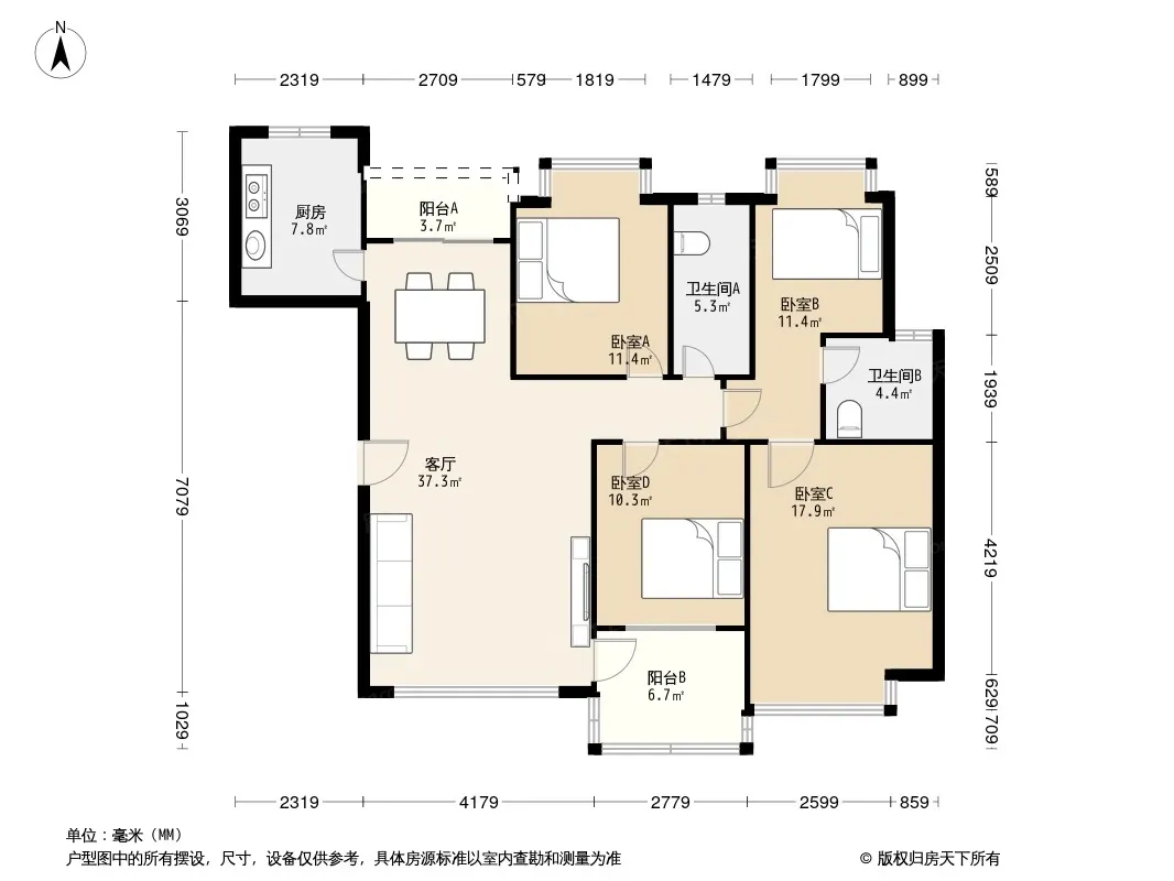 户型齐全,主打明卫,独立衣帽间,客厅朝南四居