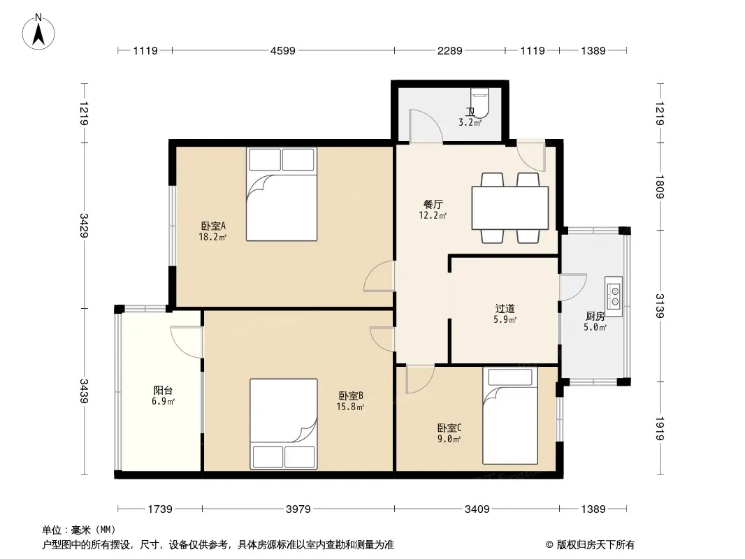 户型齐全,主打户型方正,明厨,客厅朝南,主卧朝南二居