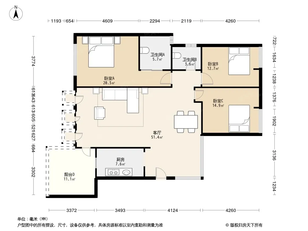 户型齐全,主打户型方正,明卫,明厨,客厅朝南,全明格局三居
