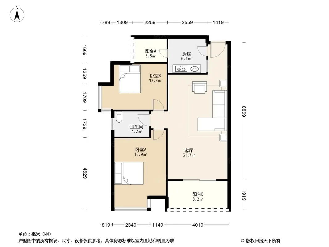户型齐全,主打户型方正,明卫,客厅朝南二居