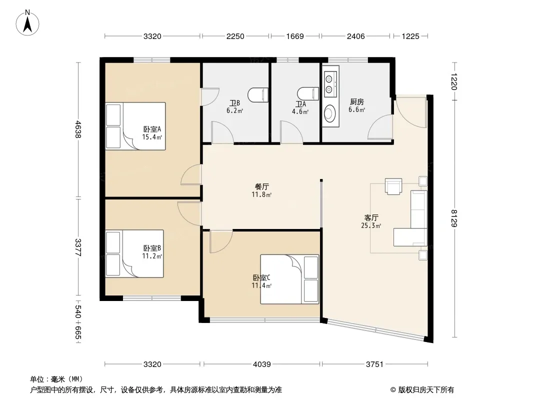 户型齐全,主打明卫,明厨,客厅朝南,全明格局三居