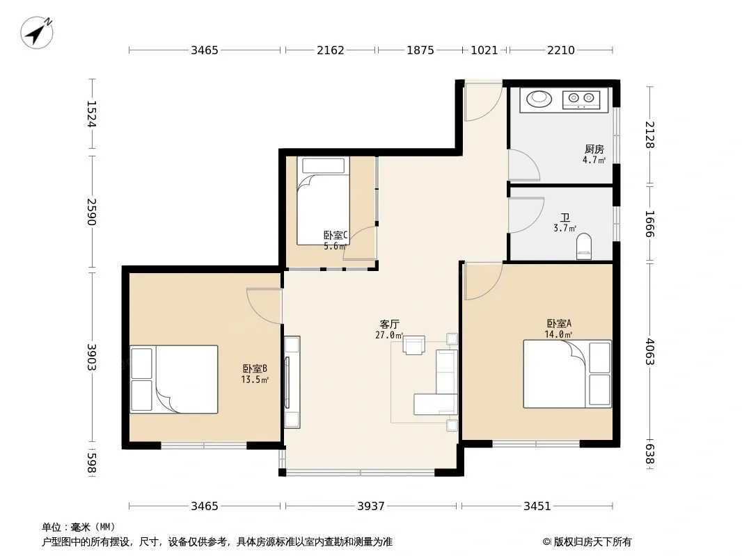 户型齐全,主打明厨,明卫,客厅朝南,全明格局三居