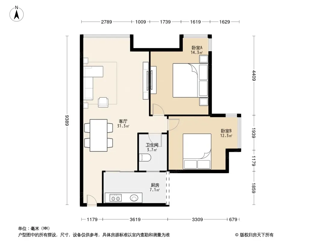 户型齐全,主打户型方正,明厨,客厅朝南二居