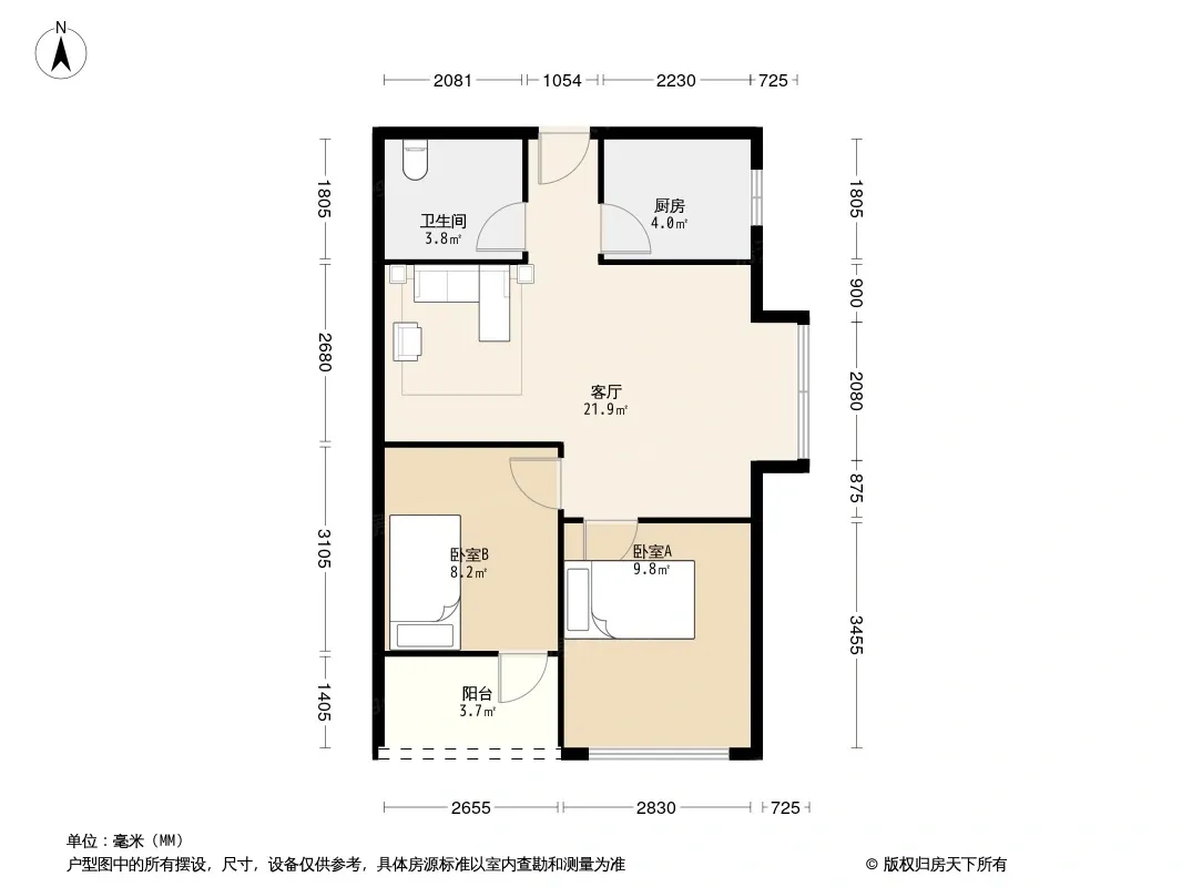户型齐全,主打客厅朝南二居