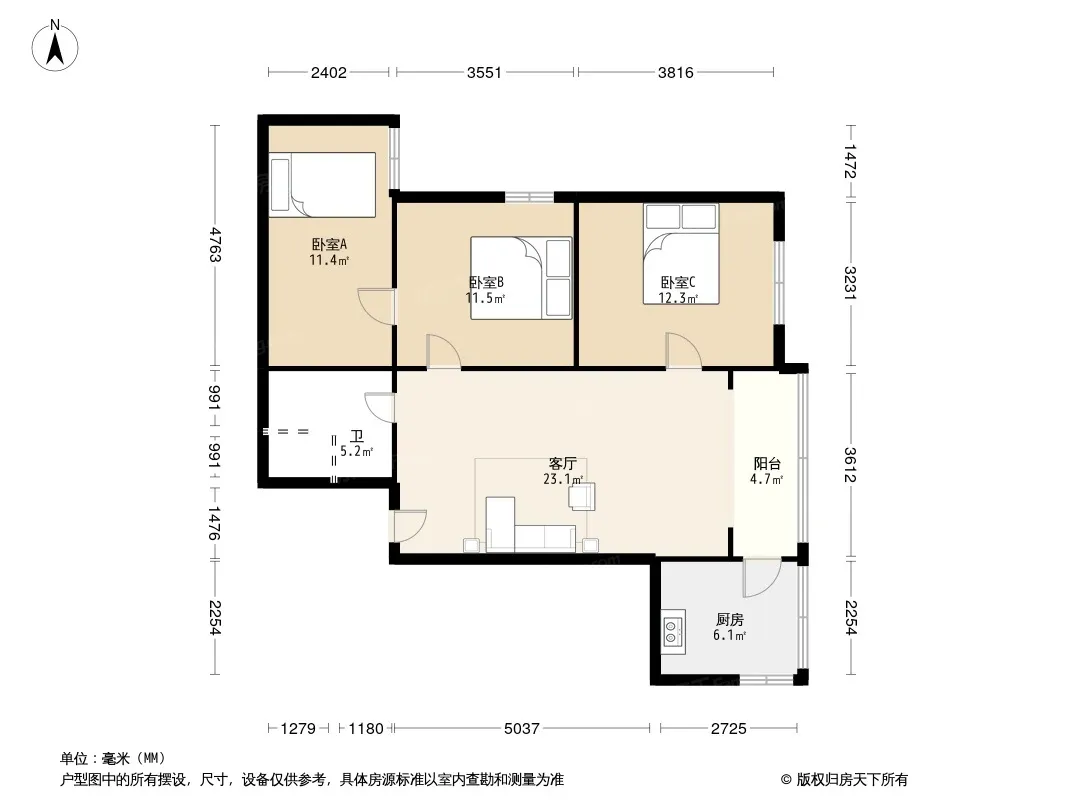 户型齐全,主打户型方正,明卫,明厨,客厅朝南,全明格局三居