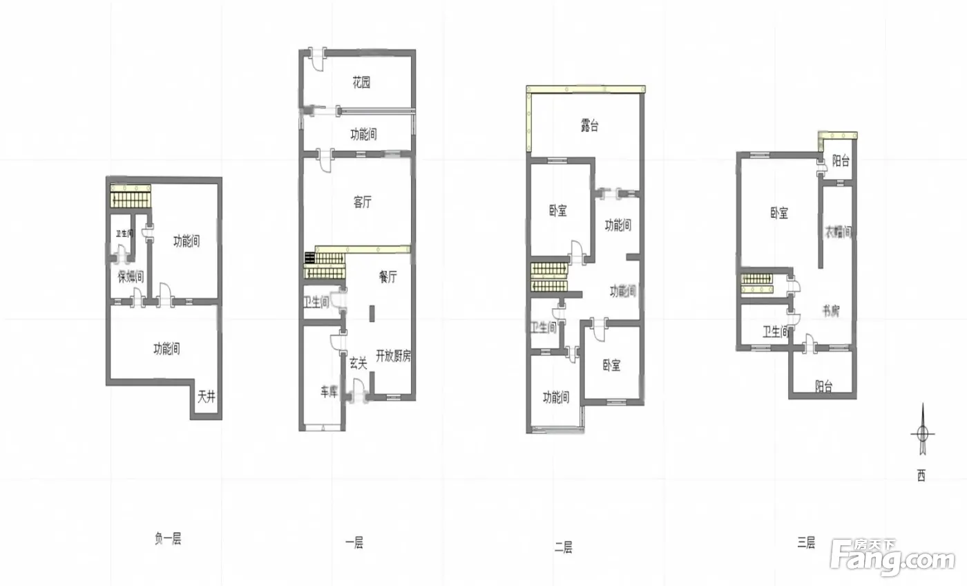 3+1结构,架空车库,带采光天井,采光很好。层层有露台,3楼全主卧空间,有书房有露台,视野好。