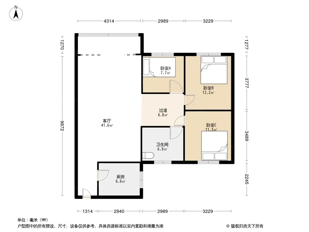 户型齐全,主打明卫,明厨,客厅朝南,全明格局三居