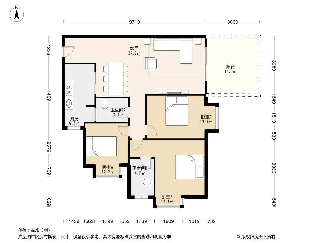 户型齐全,主打独立衣帽间,客厅朝南,双阳台三居