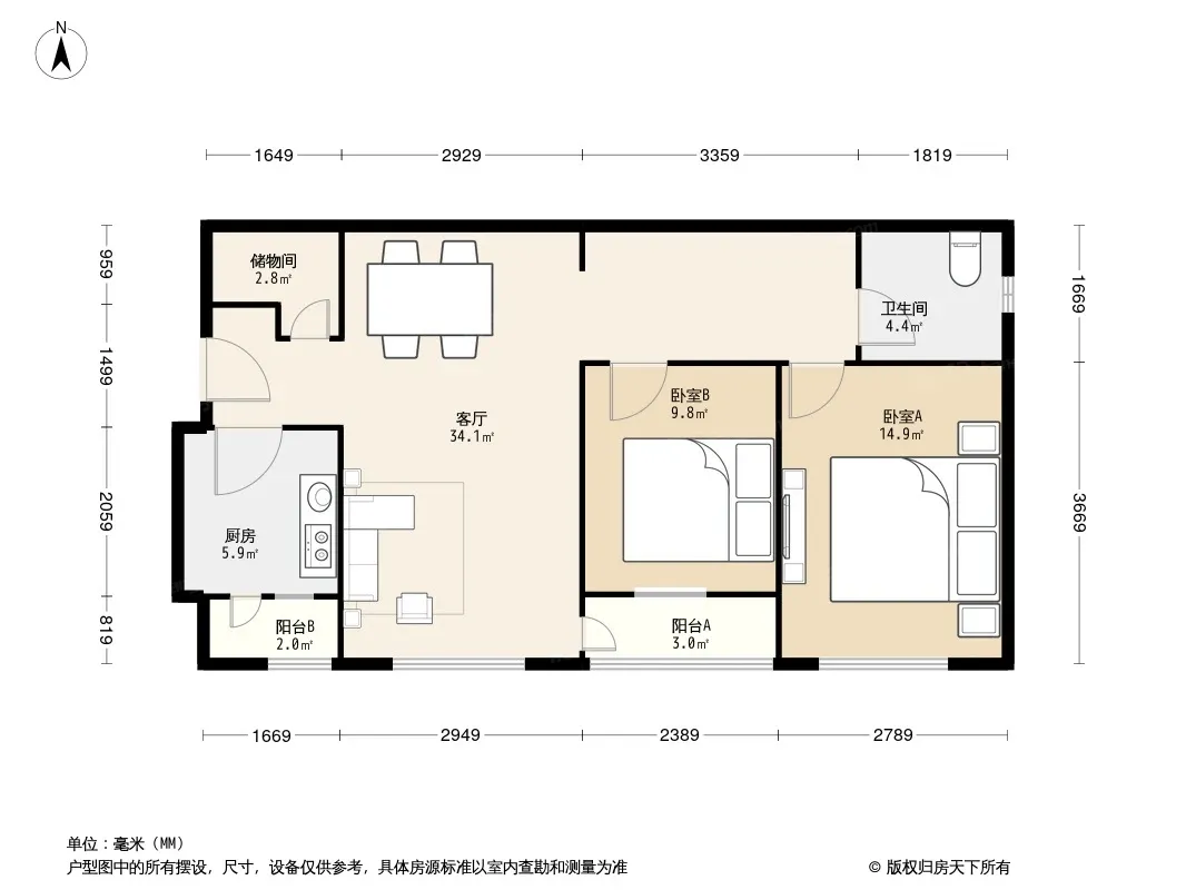 户型齐全,主打户型方正,明卫,客厅朝南,双阳台二居