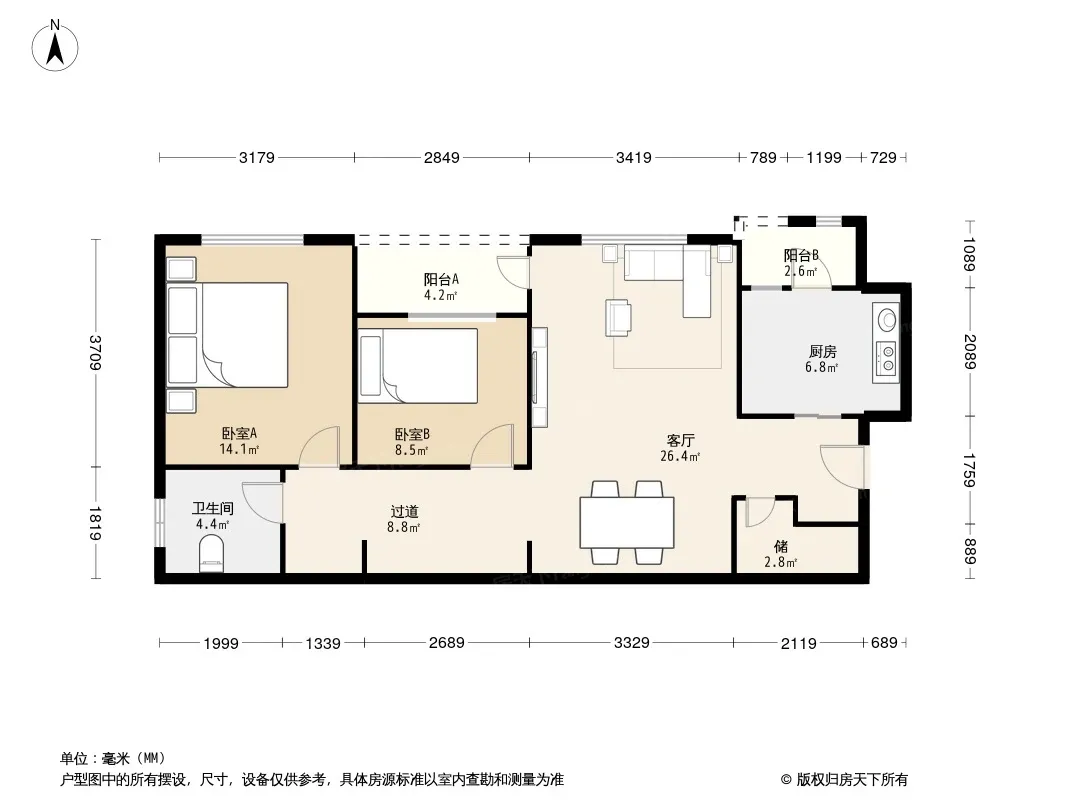 户型齐全,主打户型方正,明卫,客厅朝南,双阳台二居