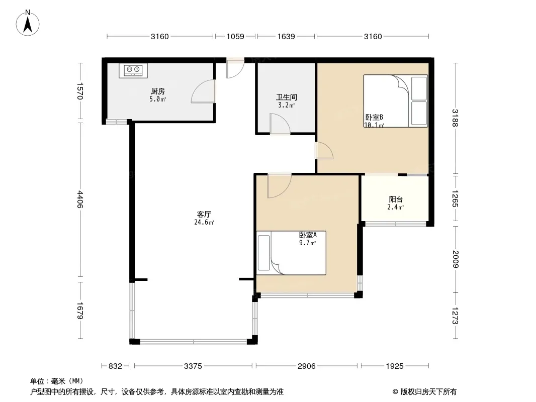 户型齐全,主打户型方正,明厨,客厅朝南,主卧朝南二居