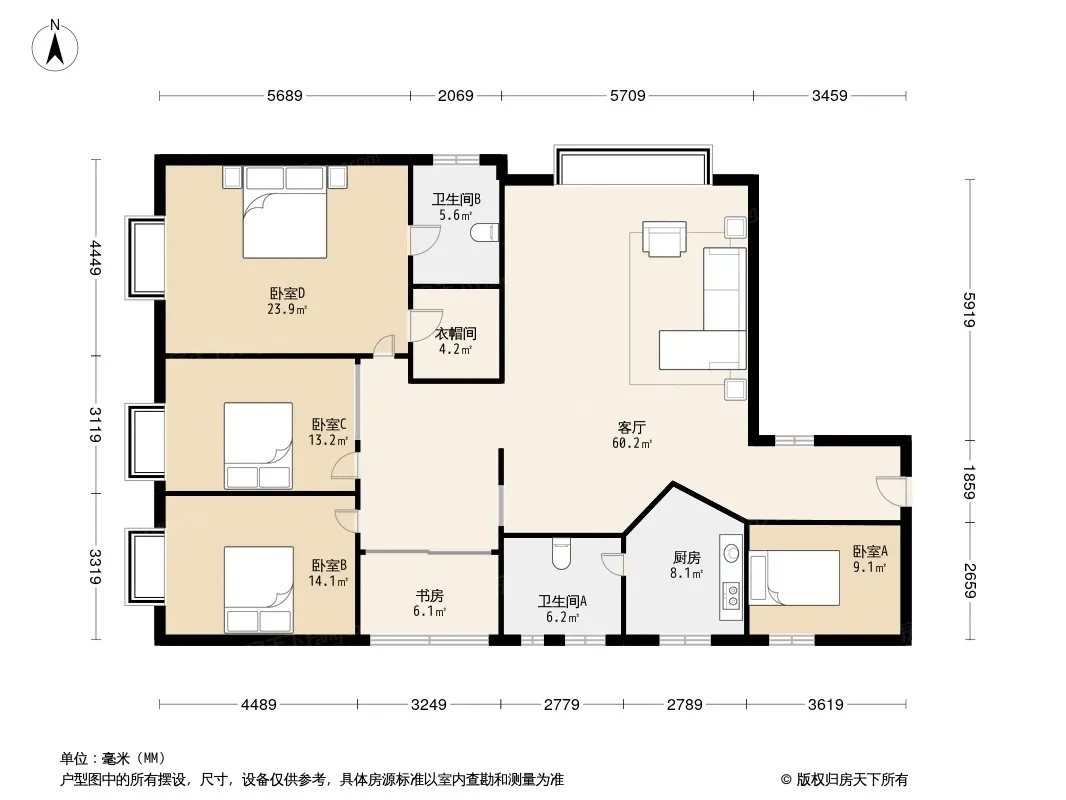 户型齐全,主打户型方正,明厨,明卫,独立衣帽间,客厅朝南,全明格局四居