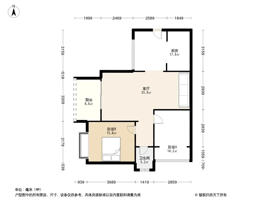 户型齐全,主打户型方正,明厨,明卫,客厅朝南,双阳台,双卧朝南三居