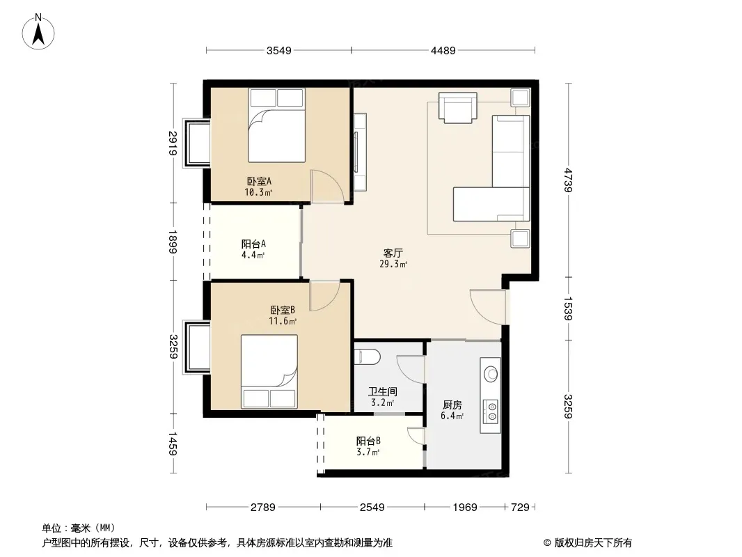户型齐全,主打明厨,客厅朝南,双卧朝南二居