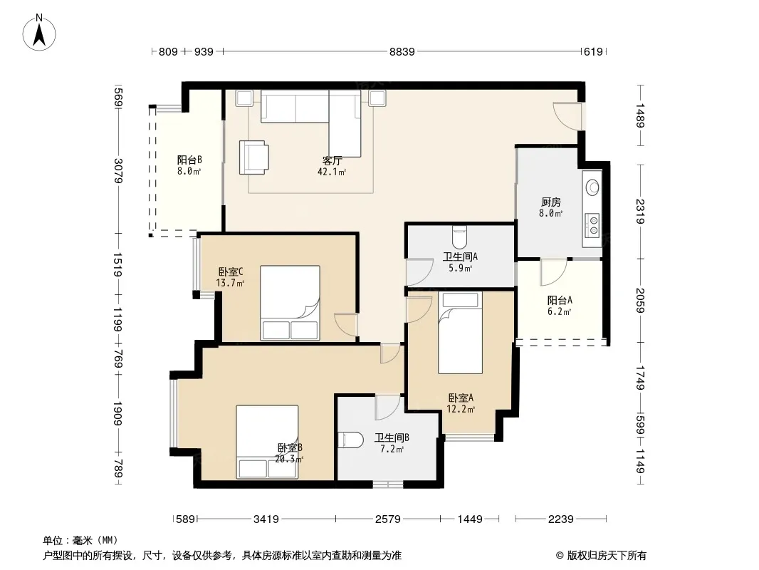 户型齐全,主打明卫,双卧朝南三居