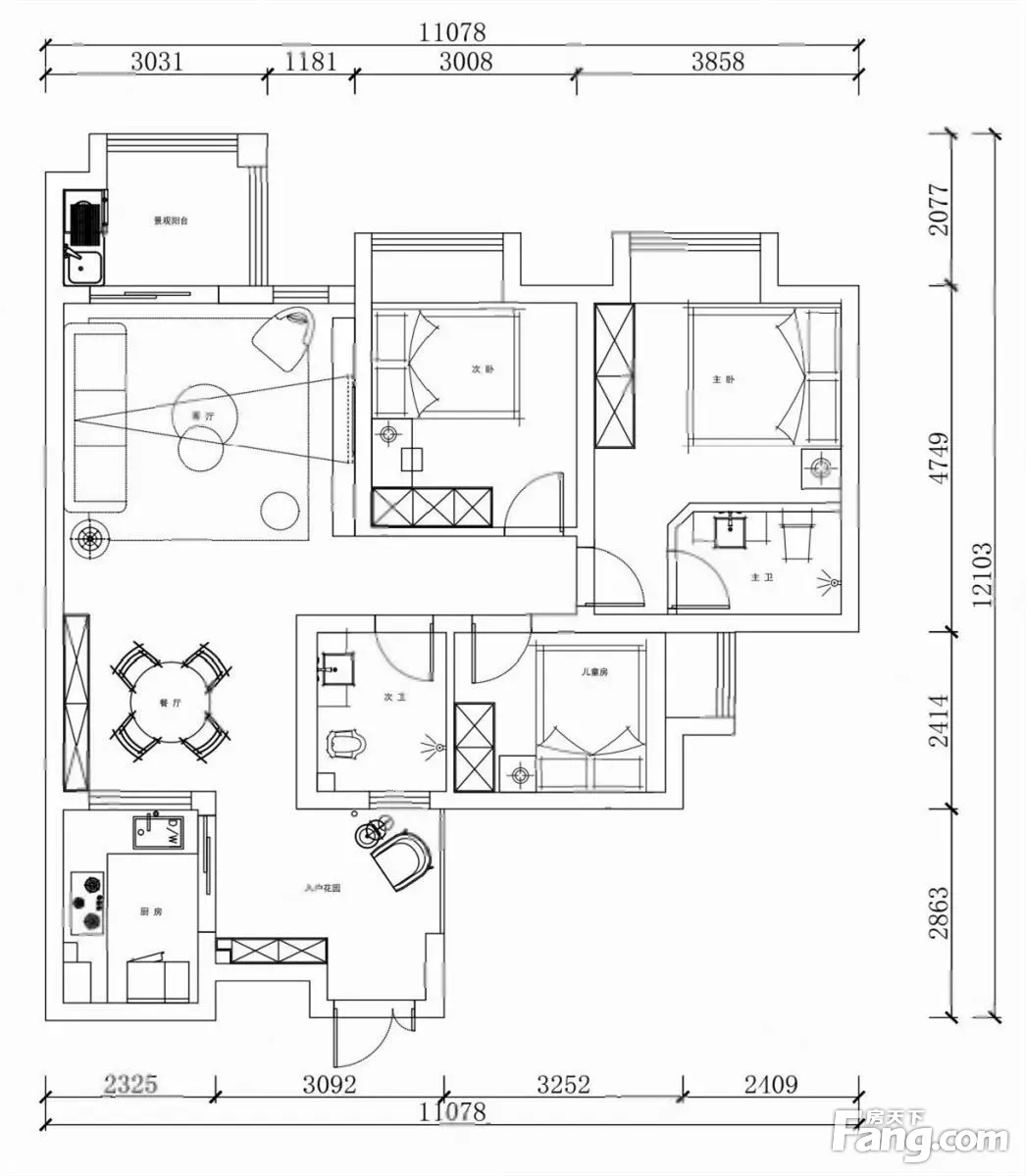 住家装修,大三房带入户花园,户型方正采光好