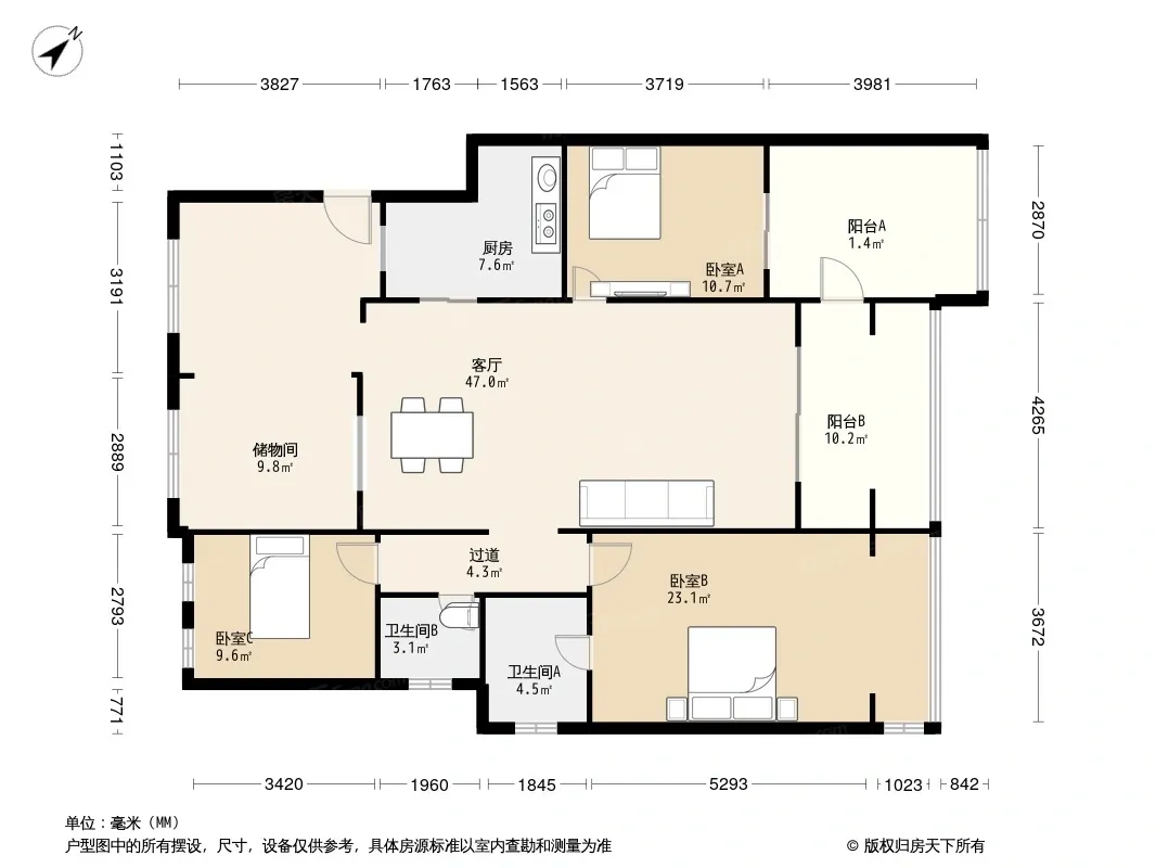 户型齐全,主打明卫,独立衣帽间,双阳台三居