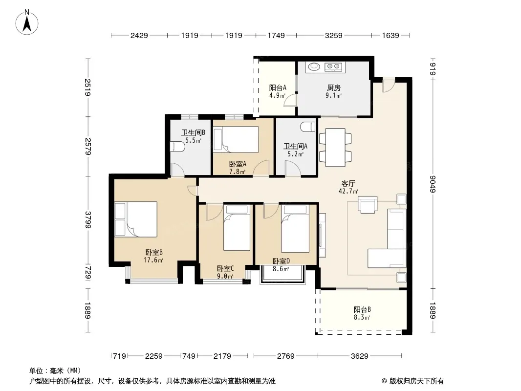 户型齐全,主打南北通透,全明格局,户型方正,动静分离,采光充足三居