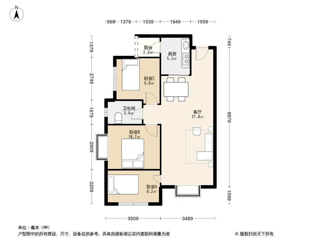 户型齐全,主打明卫,双卧朝南三居