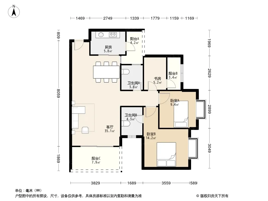 户型齐全,主打明卫,双卧朝南三居