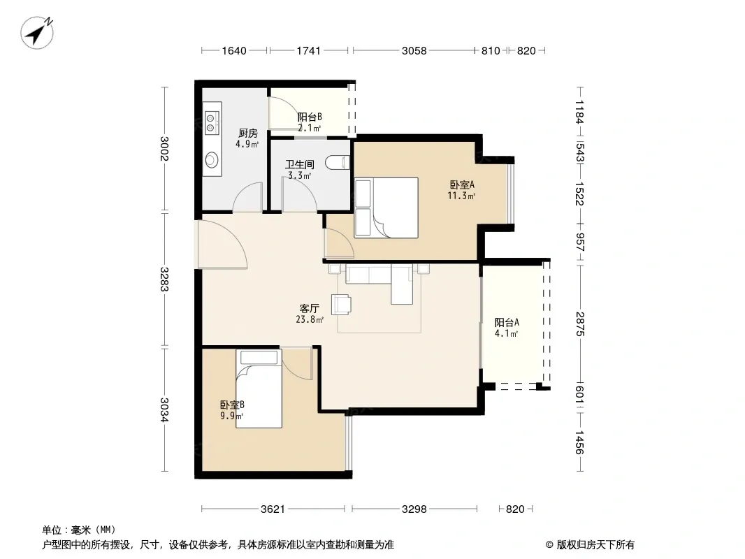 此房是个标准的两房,户型方正,采光好