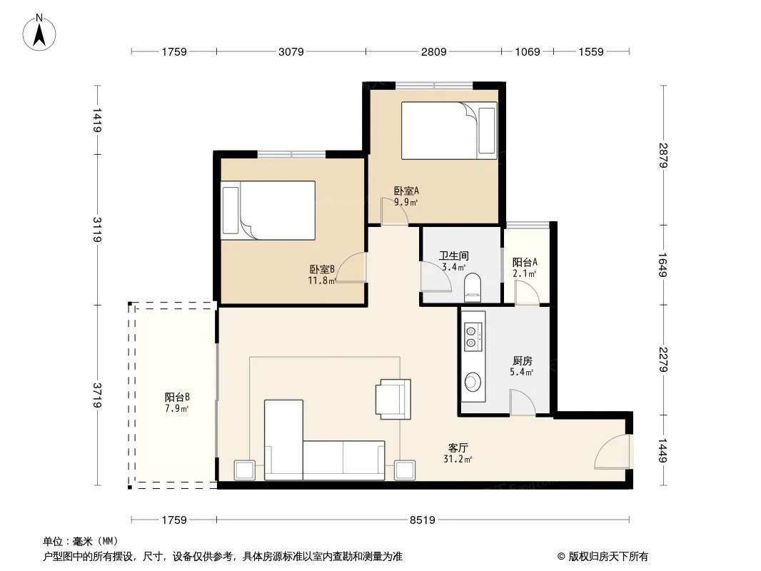 户型齐全,主打明厨,客厅朝南,主卧朝南二居