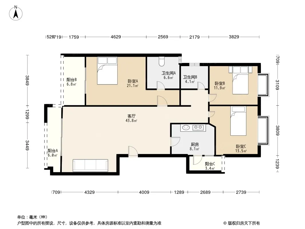 此户型卫三房两卫,户型方正采光好,住家安静。