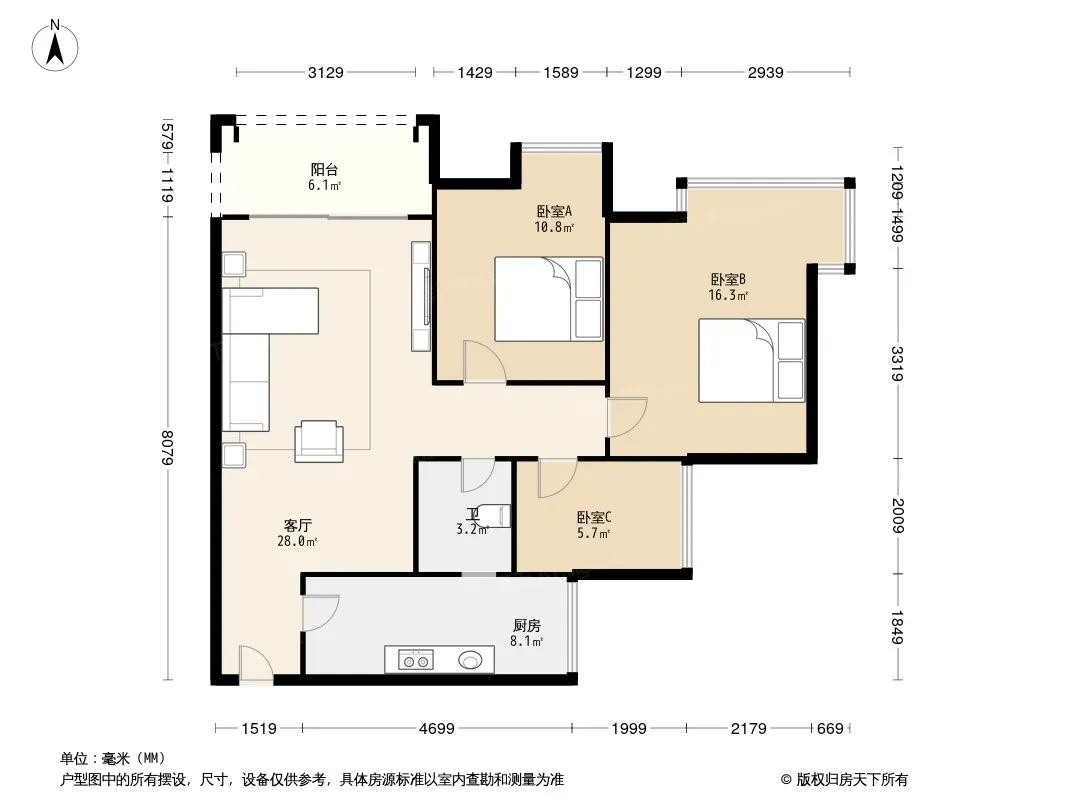 万达经典三房单卫户型,出则繁华,三条轻轨+万达+天街