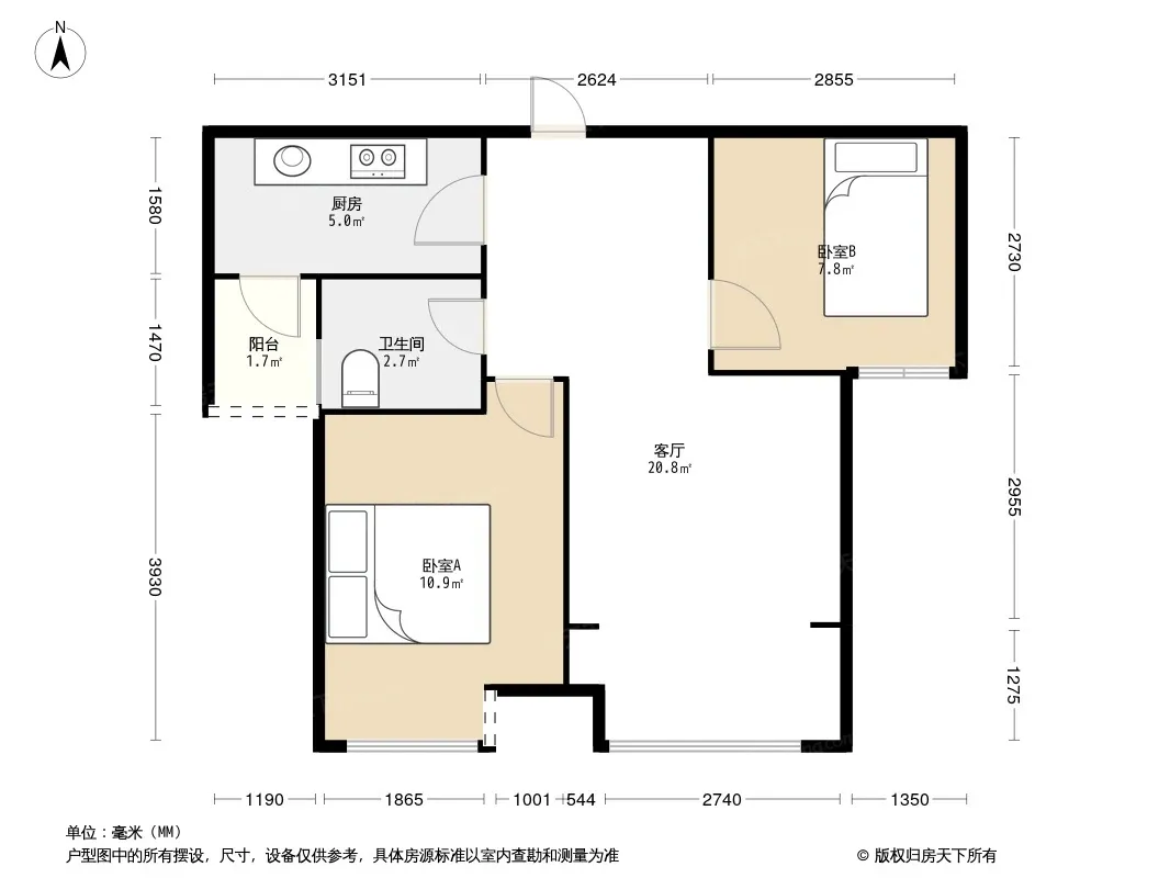 户型齐全,主打客厅朝南二居