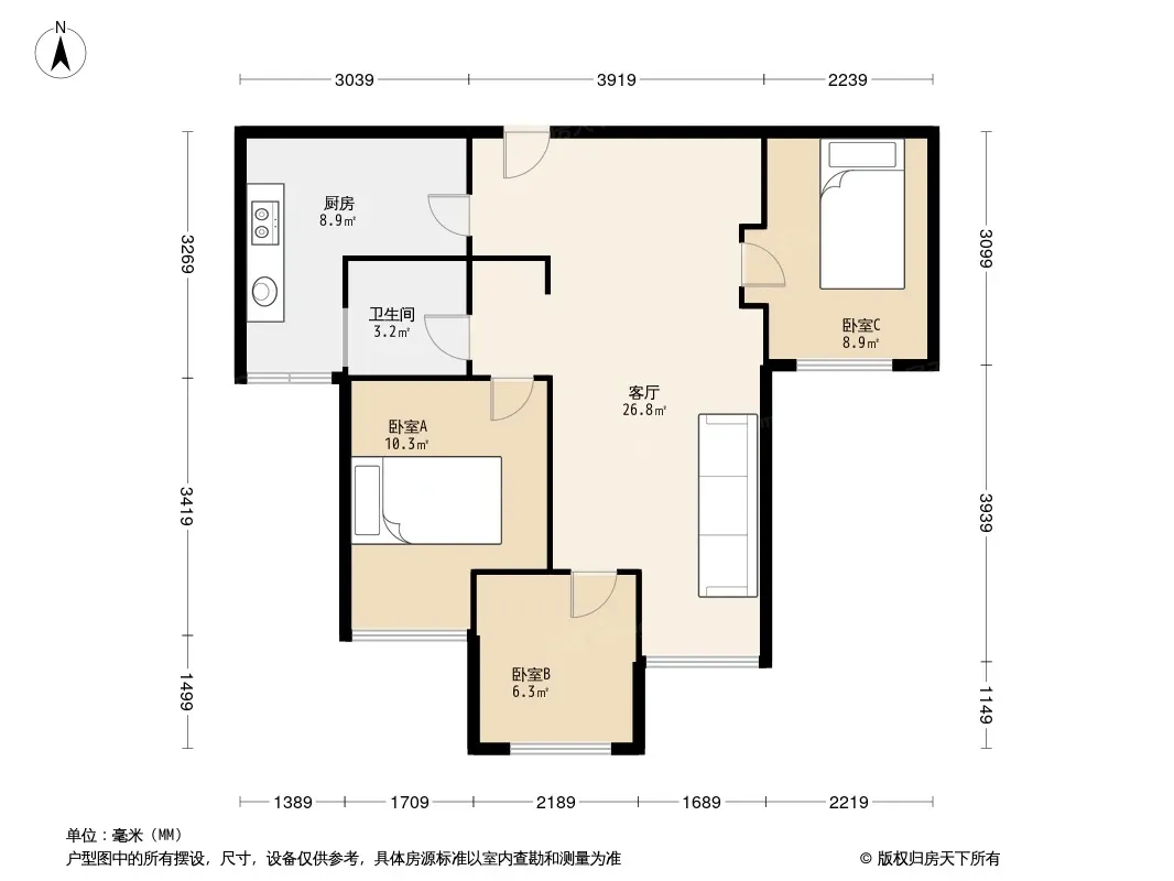 户型齐全,主打户型方正,明厨,明卫,客厅朝南,双卧朝南三居