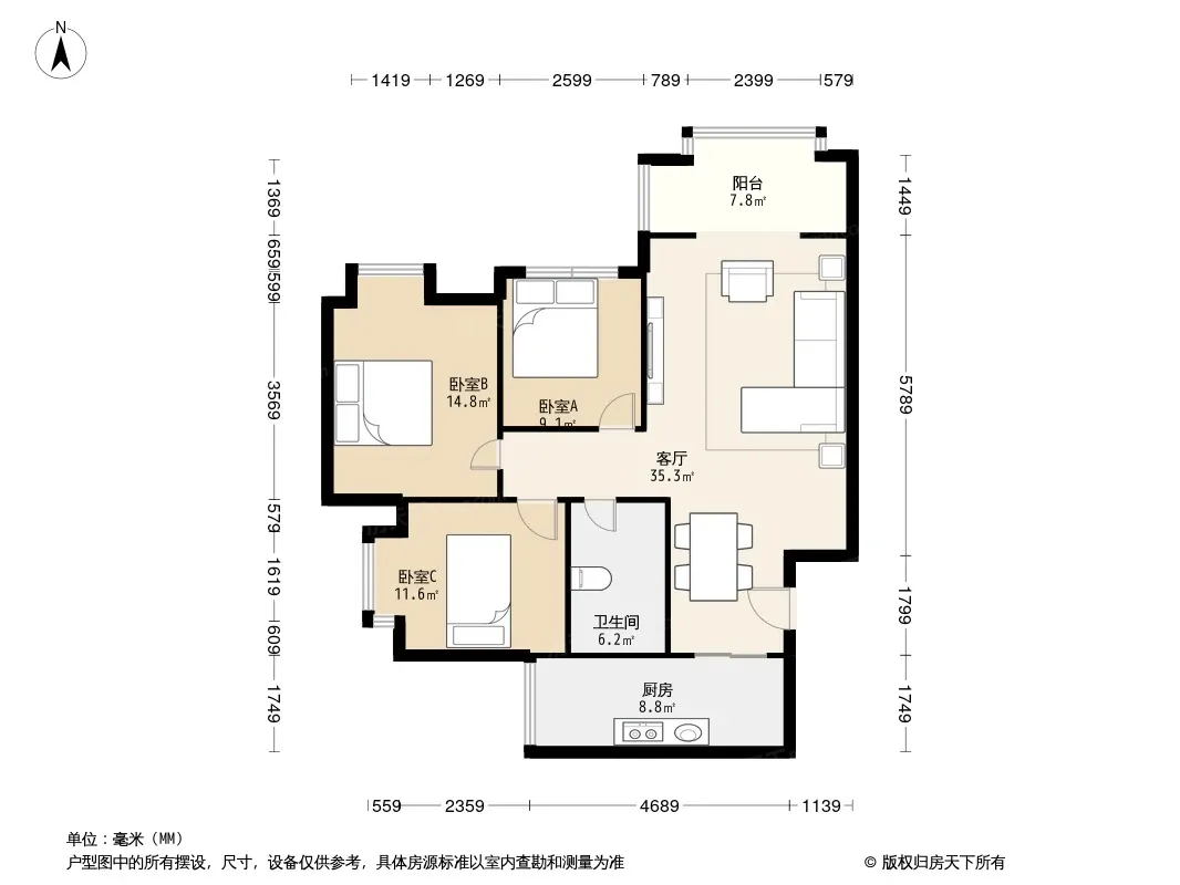户型齐全,主打明卫,双阳台,主卧朝南三居