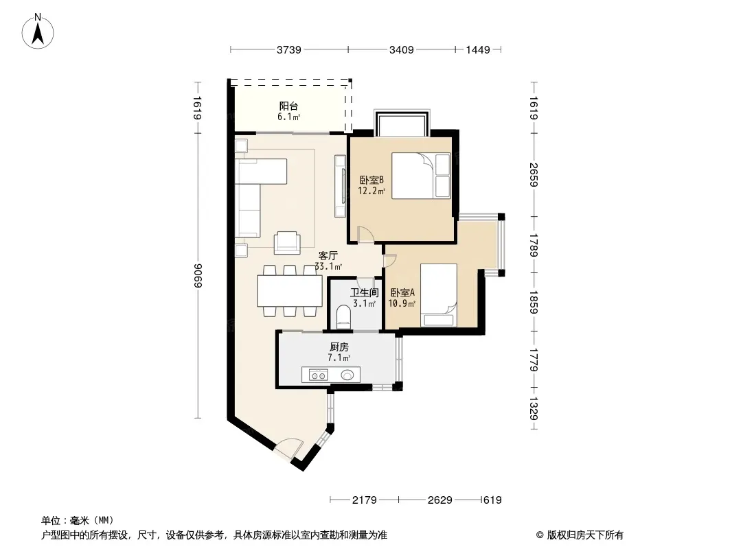 户型齐全,主打明厨,客厅朝南二居