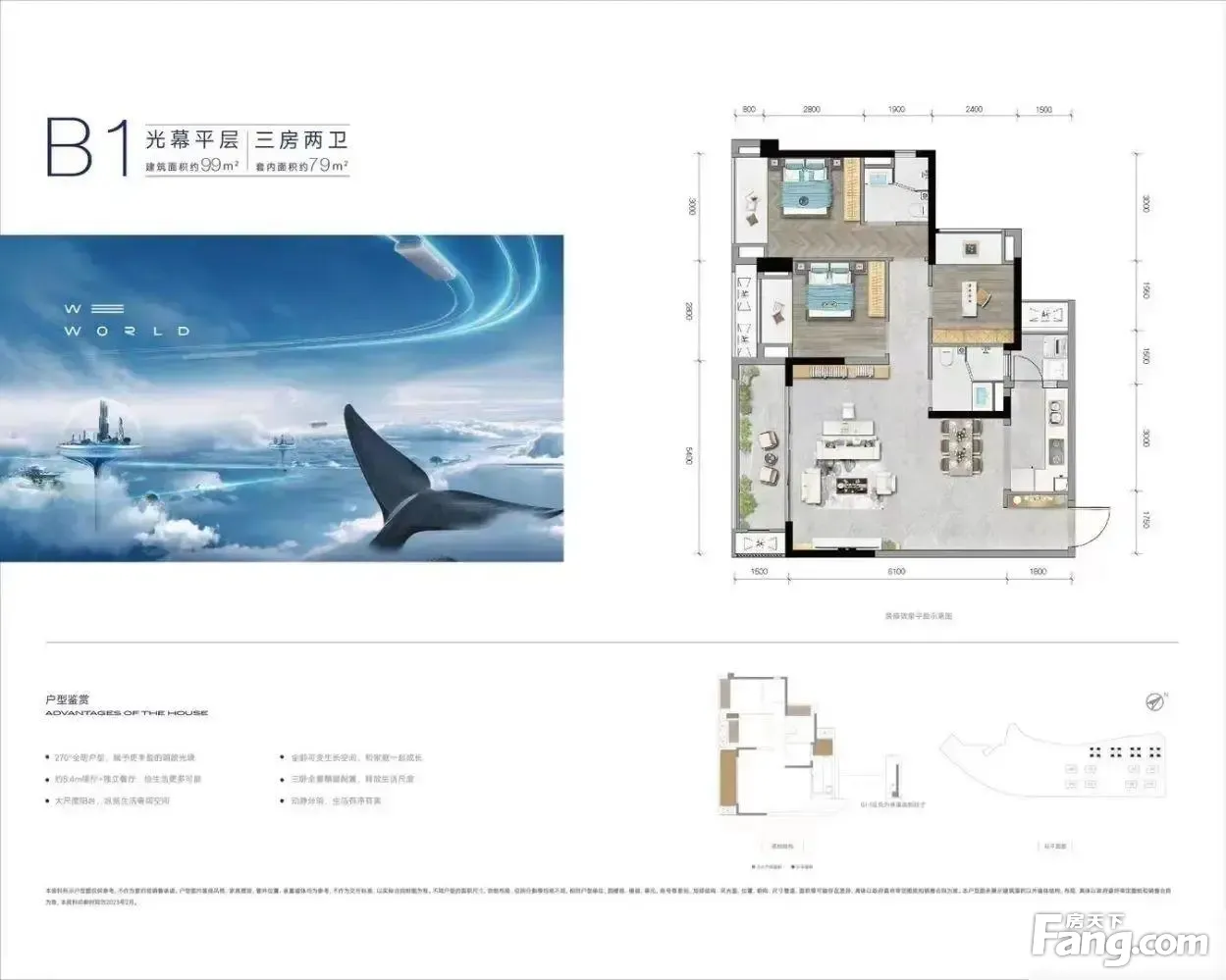户型齐全,主打户型方正,明厨,客厅朝南,主卧朝南二居