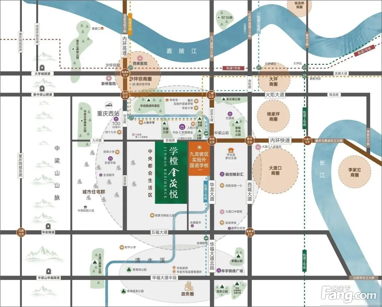 1、学习:门口重+庆+外+国+语+学+校。 2、生活配套: 项目直线距离约300米范围内有8万方仁和时光里商业综合体,直线约1.5公里内有5万方融创精彩汇3、交通:重庆西站,距离轻轨5号线中梁山站直线距离600米,门口即盾安公交站全城任意换乘 无缝衔接 4、环境:西有中梁山山脉,国家5A级风景区,北临三大公园,人和公园、幸福公园、民康公园,得天独厚的自然资源,为您提供优质生态宜居环境 5、医疗:西区 西南 新桥三甲重点医院为您保驾护航