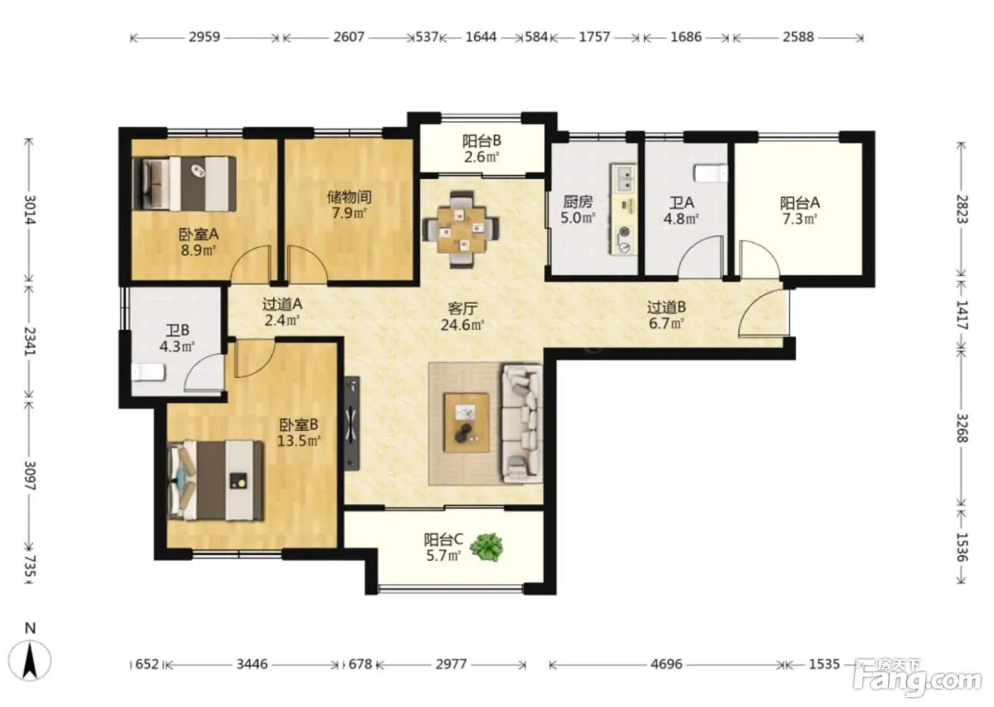 户型齐全,主打明卫,明厨,客厅朝南,全明格局,双卧朝南二居