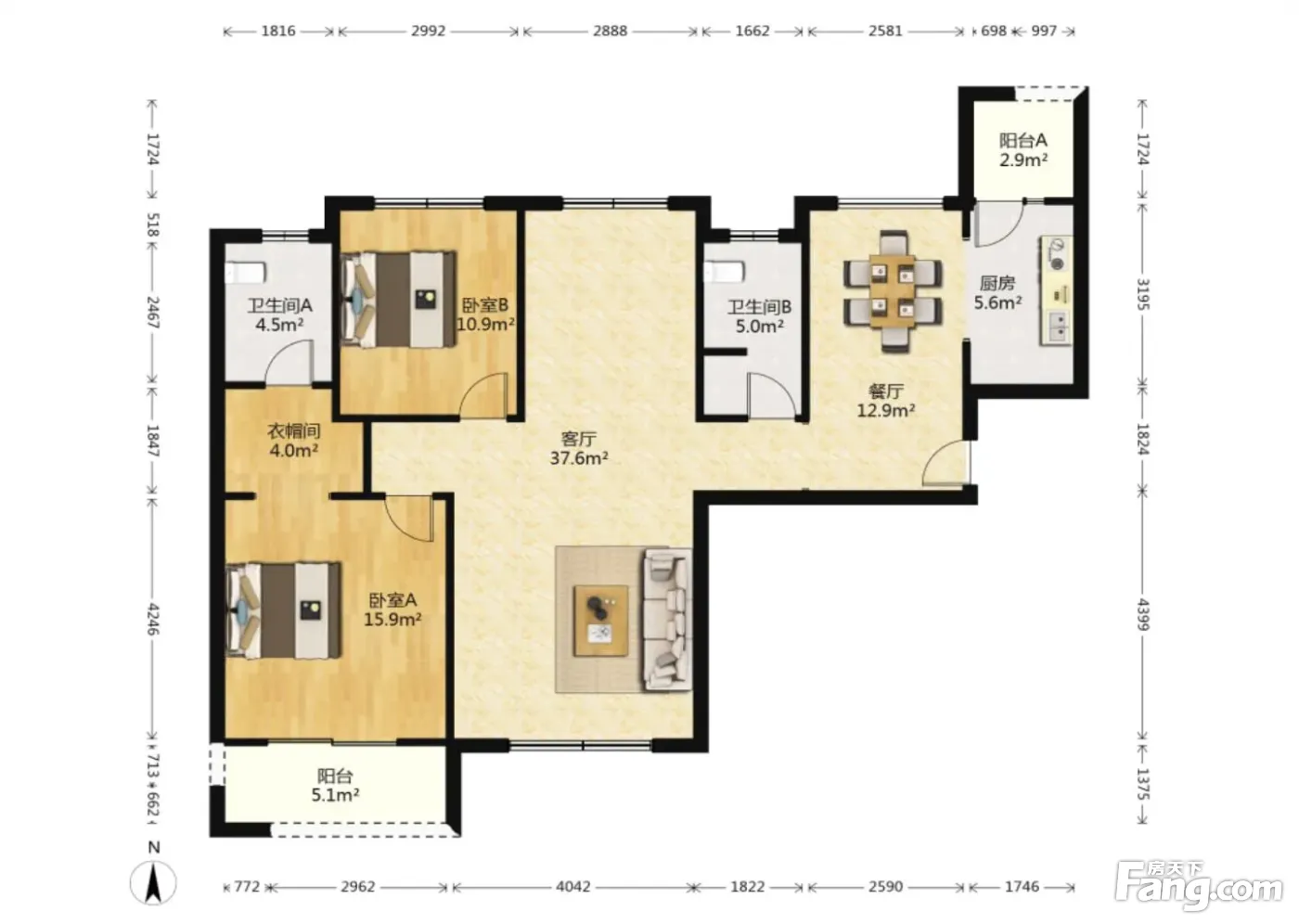 户型齐全,主打南北通透,主卧带卫,带衣帽间三居