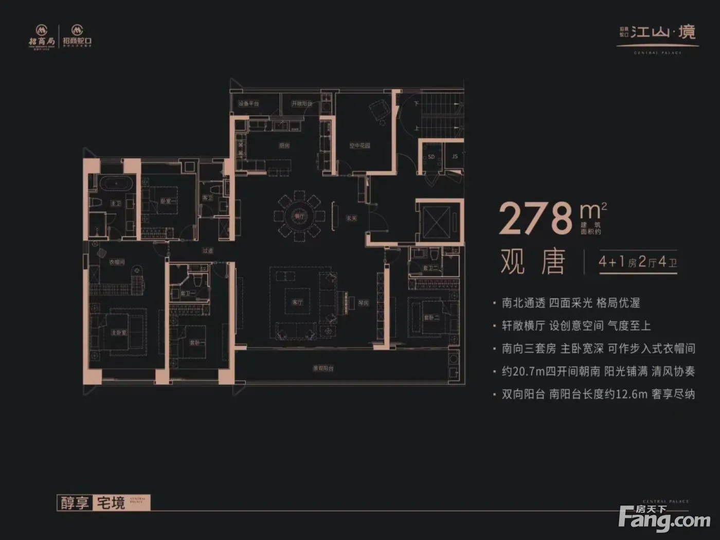招商蛇口·江山境户型主要有190平-281平的户型方正,客厅朝南的四居 、278平-278平的户型方正,客厅朝南的五居 。