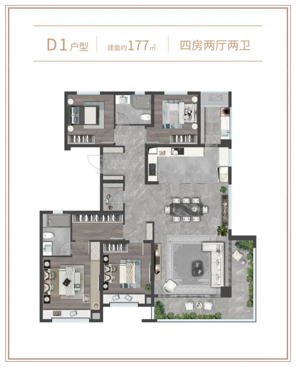 1.131平米四房约3M层高,南北通透,全卧均享舒适面宽U型厨房设计,预留独立小家电台,生活更从容 约6.7M南向观景阳台。 2.户型142㎡灵动3+1,南北通透,三开间朝南独立玄关入户,约3M层高悦享生活阔绰LDKB可视互动餐厨厅阳台一体化空间约8.6M南向景观阳台,拥享更多阳光宠爱套房式主卧尊享独立卫浴,景观飘窗迎清风美好 3.户型 177㎡,独立对称玄关,超大入户收纳空间LDKB可视互动餐厨厅阳台一体化空间约270°超大转角景观阳台,尽显主人品位墅级客餐厅,等宽全景享四季舒境独立生活阳台,超大储物空间,延伸生活尺度 南北双阳台设计。