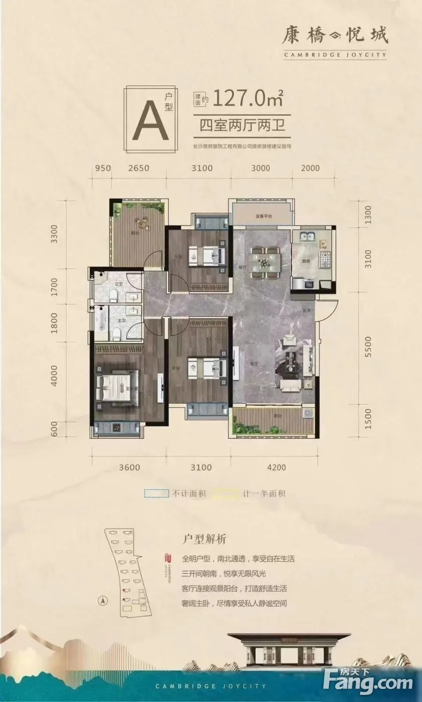 5,6栋为25层的小高层,5栋的西边户为127平,中间户为108平,东边户为131平。6栋东西边户为129平,中间户为复式124平。 月亮岛超高性价比纯新盘 月亮岛双地铁·品质生活住区 【康】湘江新区月亮岛文旅新城 坐享板块红利 【桥】三横三纵三桥双地贴 出行无忧 【悦】名校为邻 享一站式菁英教育 【城】坐拥一江一岛六公园 产品类型:住宅(总共14栋) 占地面积:约8.8万方 建筑面积:约30.5万方 规划户数:1588户 即将加推:5#6# 加推面积:平层,复式124 毛坯均价:10600元/平 层 高 :2.9米 梯 户 比 :2梯4户 容 积 率 :住宅2.8 公 摊:19%左右 得房率 :加赠送面积90% 绿化率 :35% 车 位 :1900+ 车位比1:1.19 物业公司:润卓物业 物 业 费 :2.4元/平 交房时间:5#6#2025年5月30日